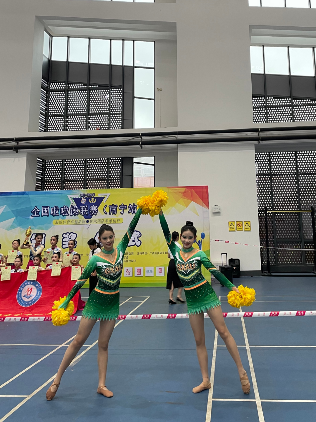 公司啦啦队有25名运动员参加了5个项目的比赛,他们在赛场上团结协作稳定发挥,充分体现了顽强拼搏的体育精神,展示了广艺青年学子积极向上的精神风貌,分别获得了公开青年乙组双人花球第一名、公开青年乙组双人爵士第一名、公开青年乙组爵士规定动作3级第一名、公开青年乙组花球规定动作0级第一名。