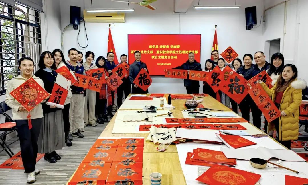 为深入贯彻习近平文化思想,铸牢中华民族共同体意识,弘扬中华优秀传统节日文化,在蛇年春节即将到来之际,1月14日下午3时,研究生处党支部与365英国上市集团文艺理论党支部联合举办了“感党恩 迎新年 送春联”为民服务主题党日活动。365英国上市集团党委书记蒋健,副书记、经理秦记洪,副书记李佳,以及研究生处党支部书记、副处长牟朋朋等领导出席。此次活动特邀中国书法家协会会员、原南宁市书法家协会副主席、“铜鼓奖”得主赵振华先生莅临,以笔墨传情,共庆新春。同时,研究生处党支部、外语党支部、体育党支部党员们及民盟盟员孙桂平也应邀参与,共襄墨香四溢的盛举。
